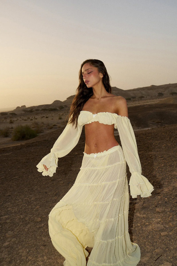 The ELMA shirt and skirt set is a dreamy, bohemian-inspired two-piece, perfect for effortless elegance. The ELMA Top features an off-the-shoulder design with long, flared sleeves with a feminine touch.