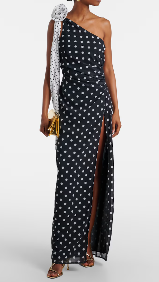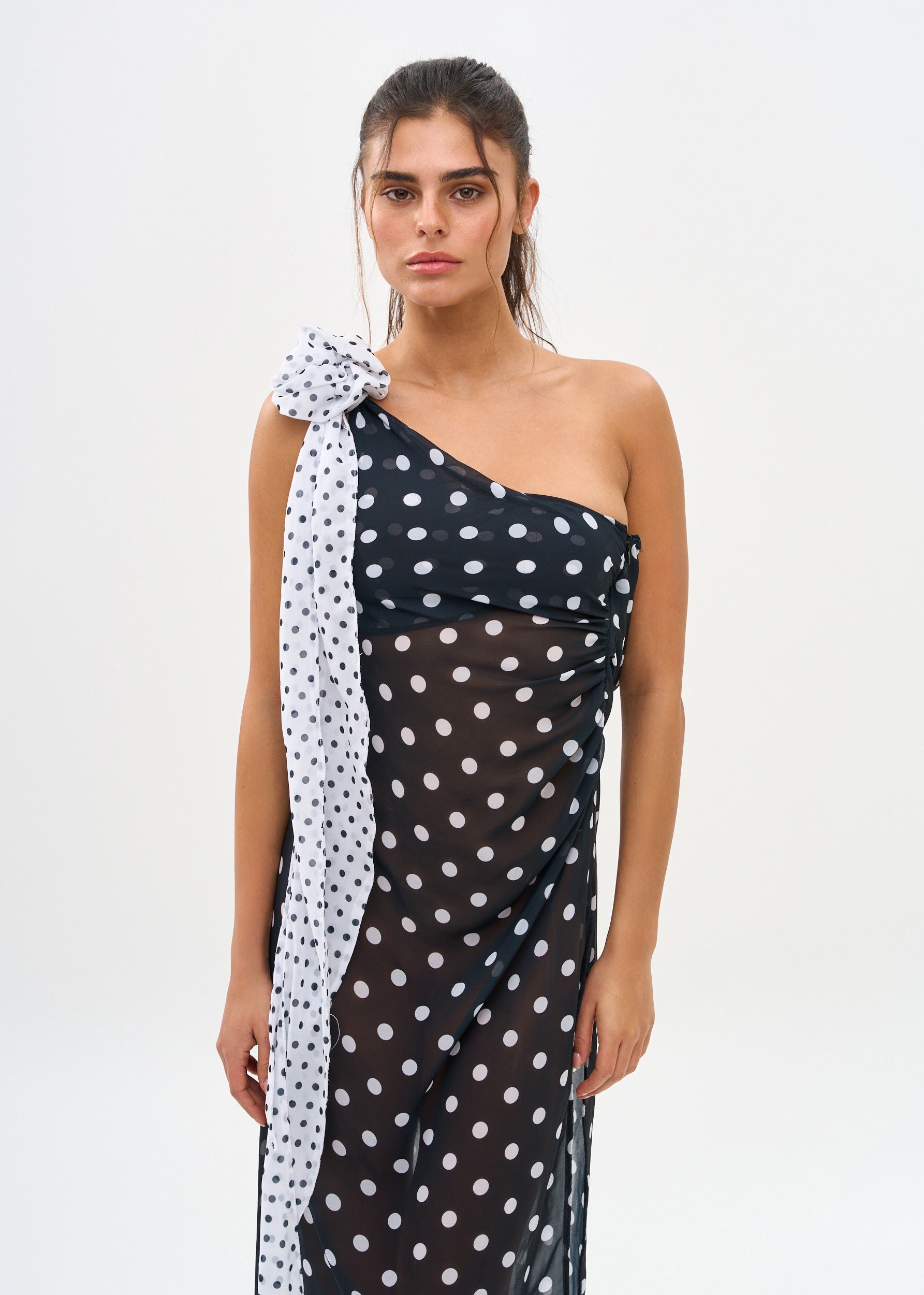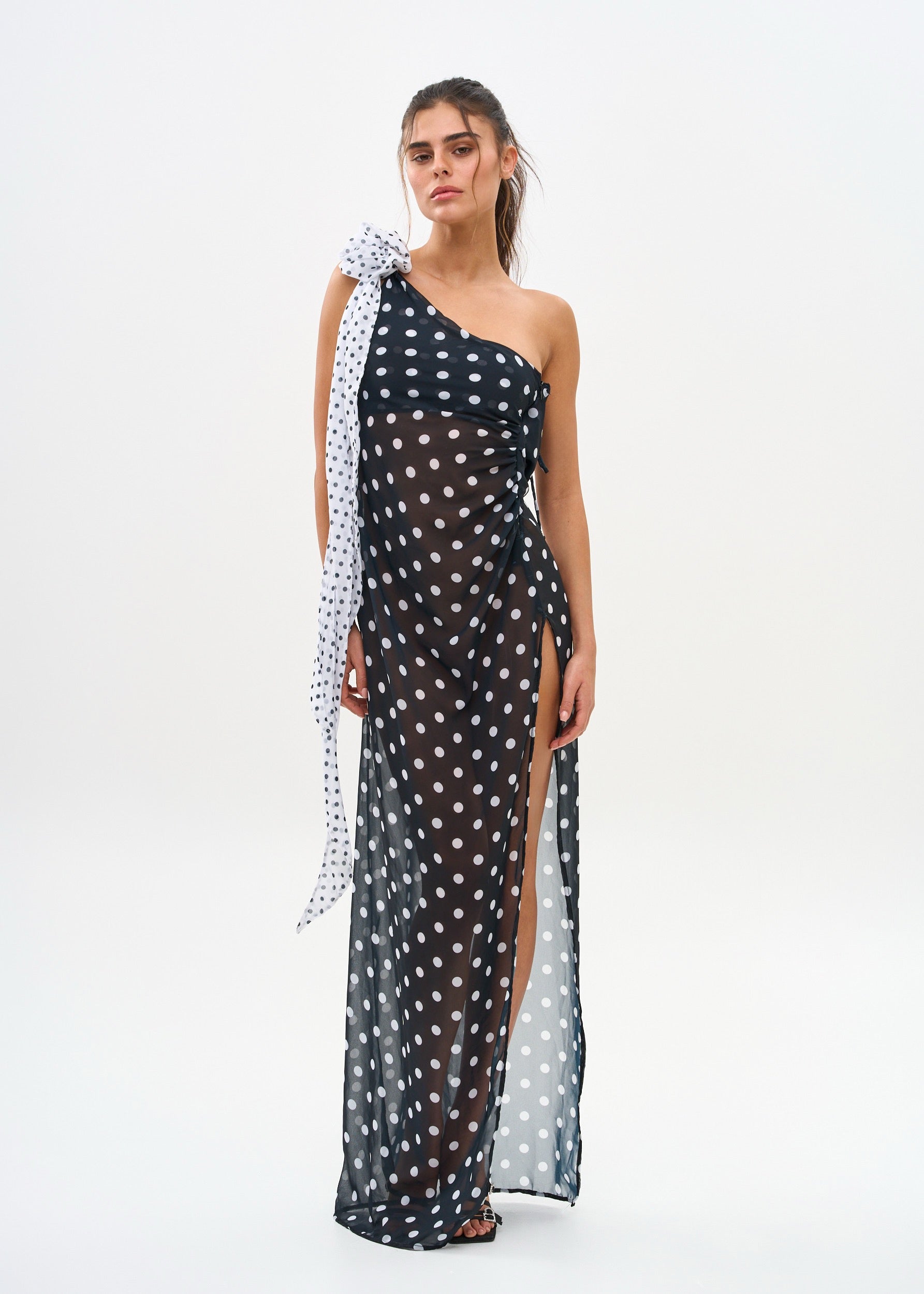 The Louise maxi dress is a striking, one-shoulder design featuring a playful black-and-white polka dot pattern. The asymmetrical neckline is accented with an oversized bow on the shoulder, adding a bold, feminine touch. The sheer, lightweight fabric drapes elegantly, with a high side slit that enhances its flowy silhouette. Perfect as a beach cover-up or for a breezy summer evening look, this dress combines glamour and effortless style.