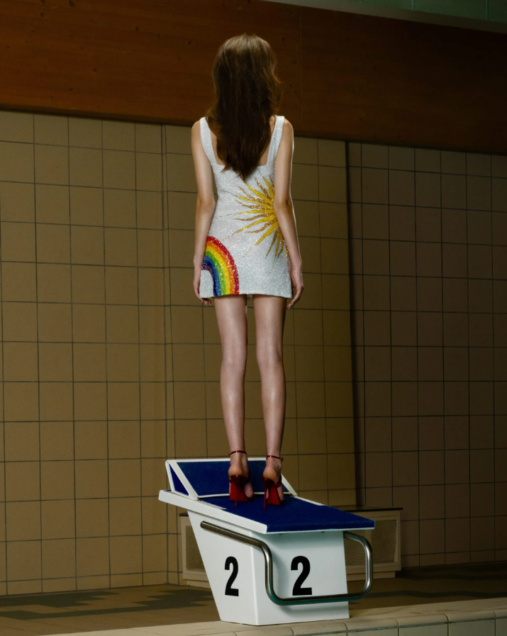 The Morning Glory mini-dress features a colorful rainbow and endorphin-inducing brightly colored sun. The iridescent white hand beading background glitters and shimmers as you move, ensuring that your inner siren spreads joy and happiness all around.
