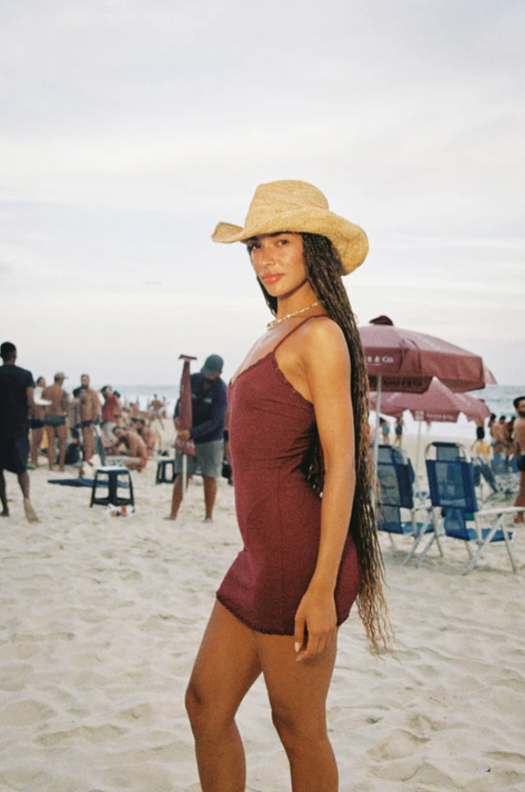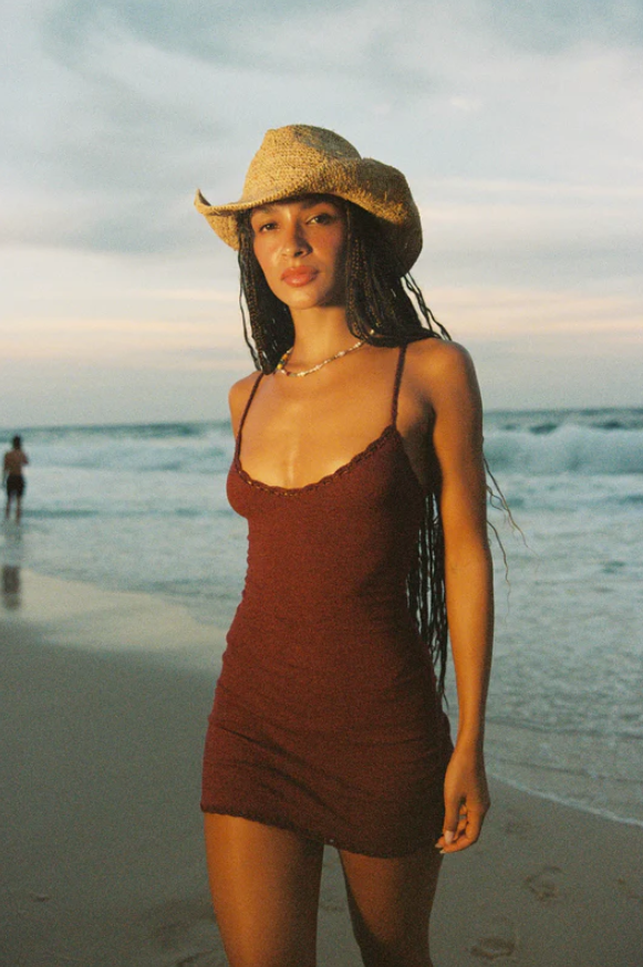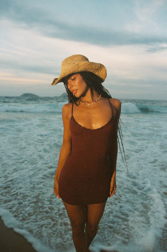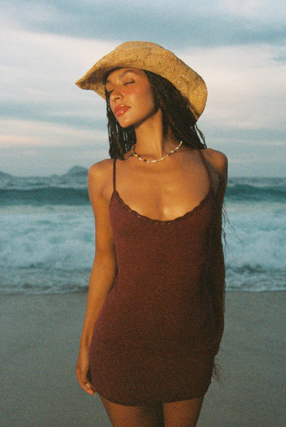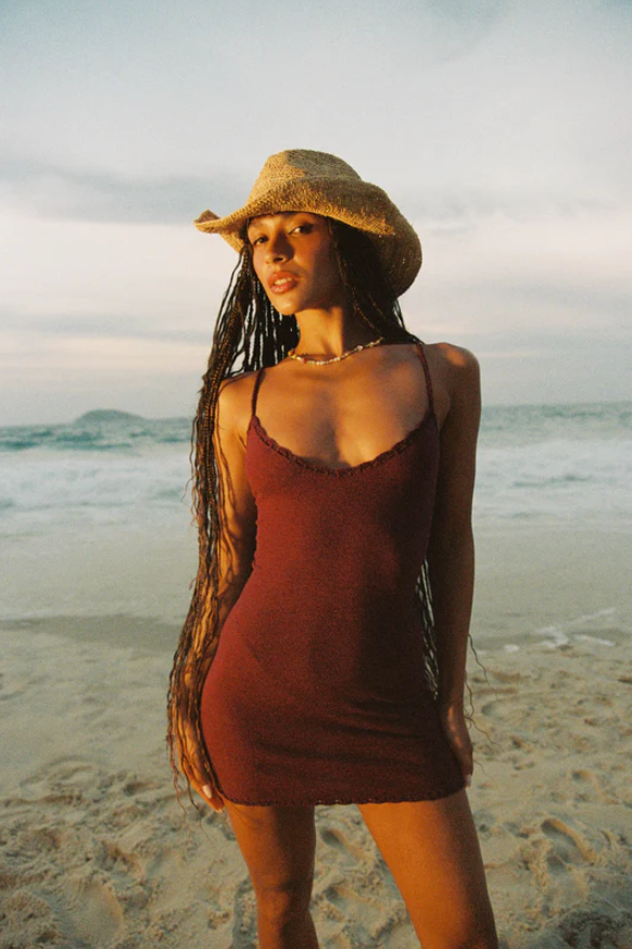 Nola dress in Bordeaux. A sultry, boho moment. We brought back one of your favorite Indah knit minis in the perfect jewel tone. This dress runs small and fits super snatched, with a semi-corseted back for a little structure. Finished in a rich, moody hue made for golden hours and late nights. Campaign model Myllena wears size S. Studio model Selina wears size S.