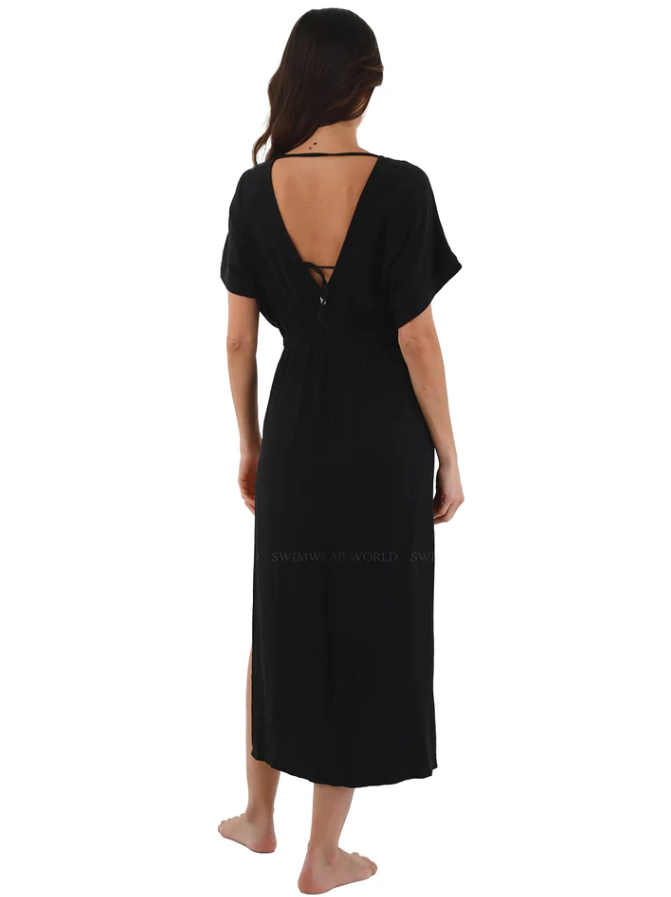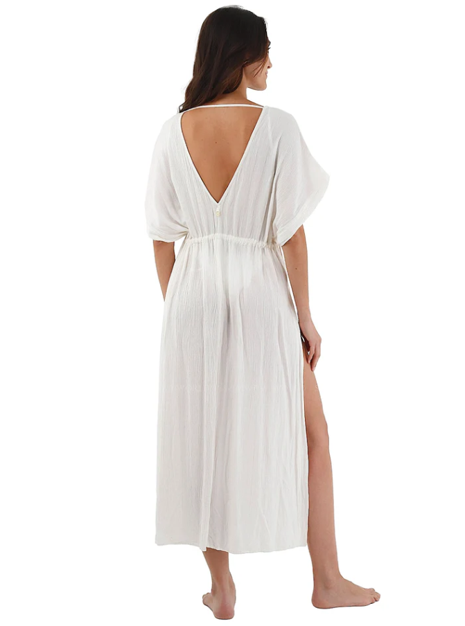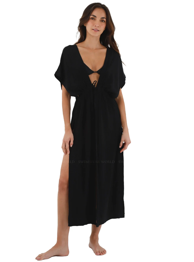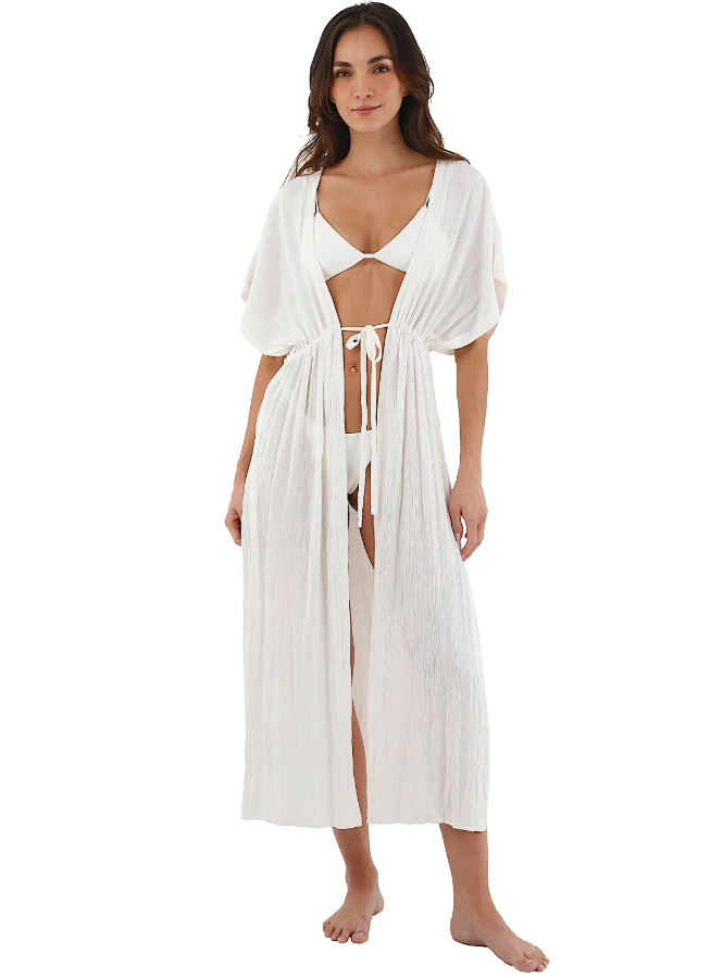 This is a flowing, kimono-style cover-up with a tie front and an open, draped design at the back. It's a versatile piece that adds a touch of elegance to your beach or poolside look.