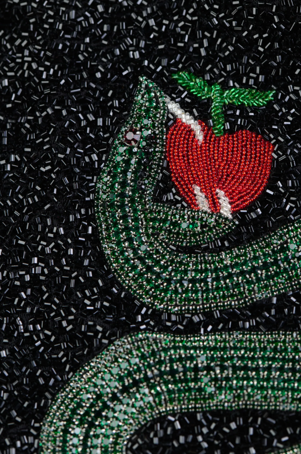 Inspired by the seductive biblical serpent this shimmering mini-dress will release the rebellious femme fatale siren within you. The artisanal hand beaded sexy black dress features a jewel toned snake offering a glittering red apple to whomever you are seeking to seduce.