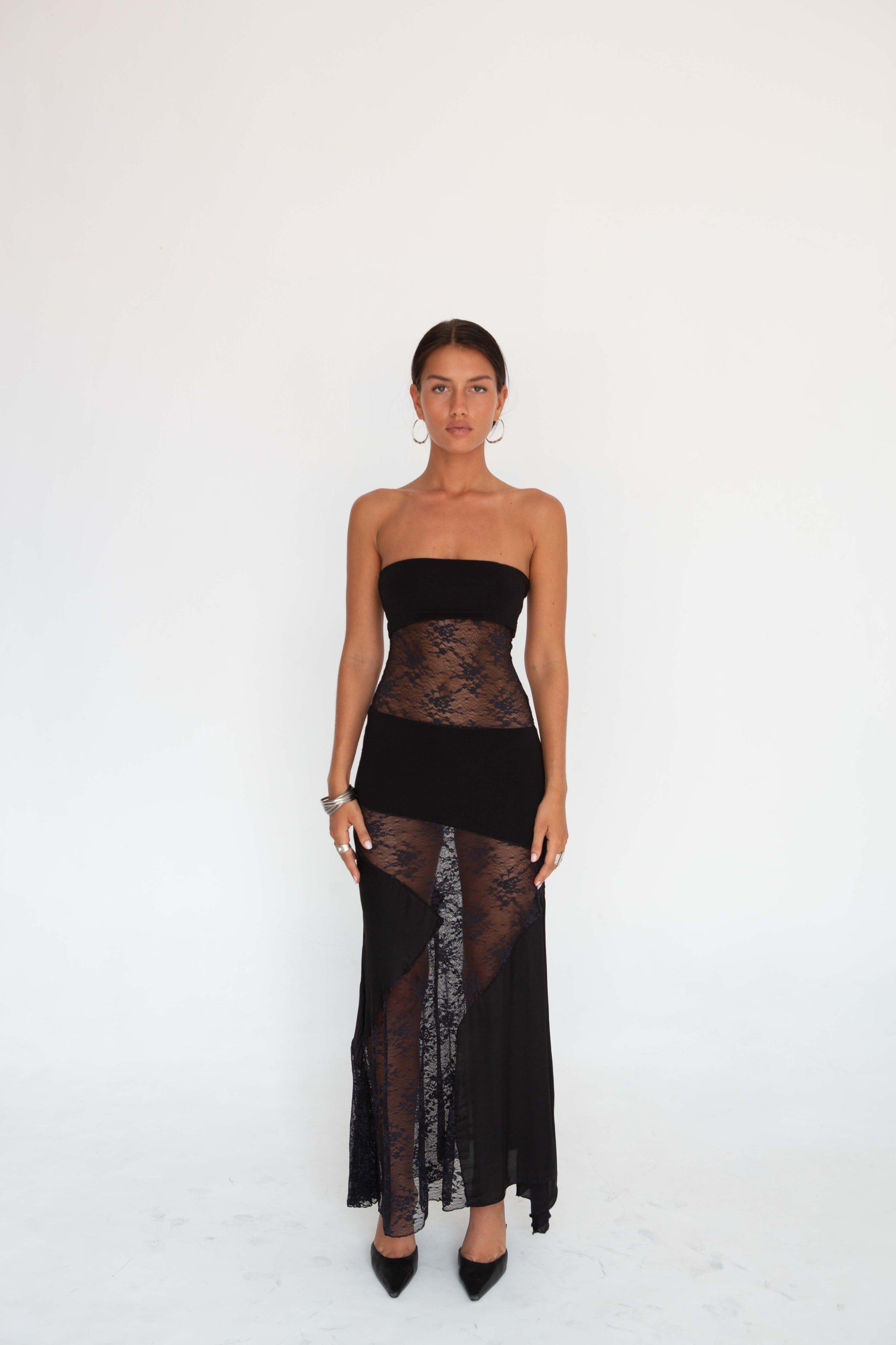 Victoria dress in Black. Designed with three layers of soft tissue modal and a stretch lace spandex bra that’s seamlessly sleek and sexy. Featuring doubled panels at the hip for coverage and a satin bottom panel cut on the bias for a waterfall effect, this dress hugs the body without being see-through. A look inspired by the 1920’s Victorian style - it’s romantic, timeless, and dreamy. Fit runs true to size. Lifestyle model Vie wears size XS. Studio model Lente wears size S.